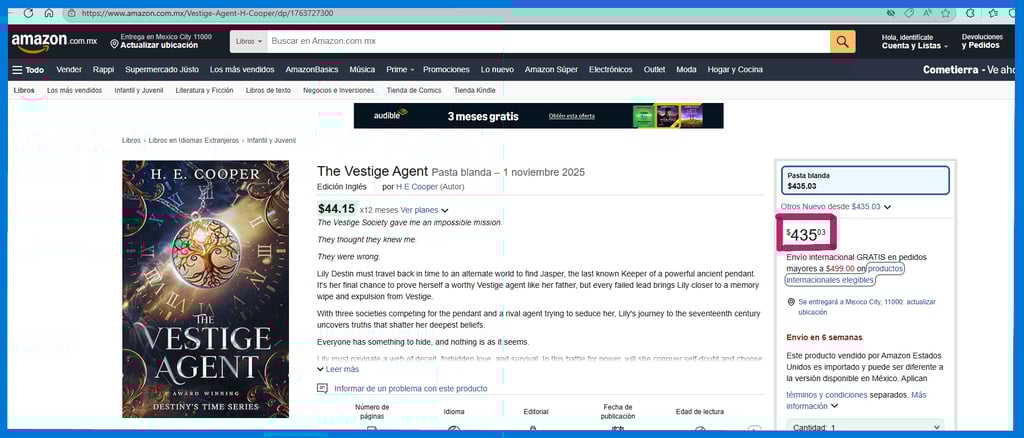 Just when I thought the saga of my book’s pricing had reached its dramatic peak, a new chapter unfolds. Only 7 days in, Amazon Mexico entered the chat—offering my humble creation for a jaw-dropping US$435.03. That’s right. Four hundred and thirty-five dollars. And three cents. For a paperback. No, it’s not bound in unicorn hide. It’s just… my book. The same one I poured my heart into, priced lovingly at a fraction of that elsewhere.