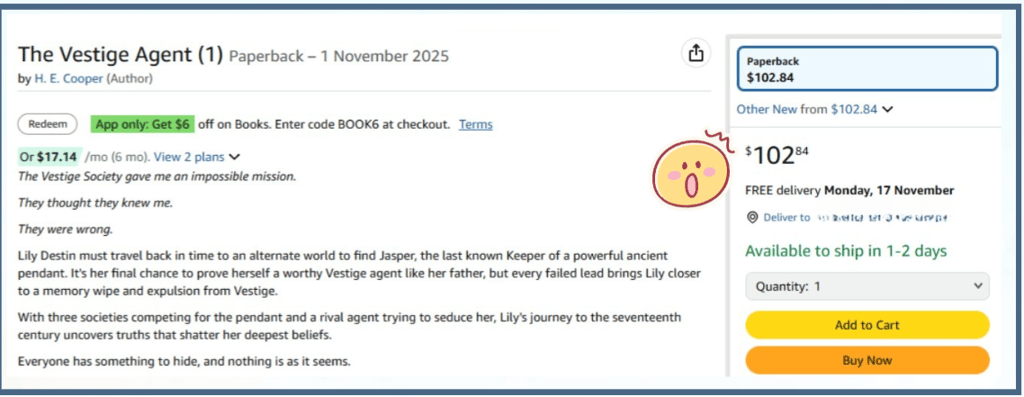 Yes. One hundred and two dollars. For a YA paperback. No, it’s not gold-foiled. No, it doesn’t come with a time-traveling sidekick. And no, I didn’t set that price—unless I did so while sleepwalking through a luxury pricing seminar.